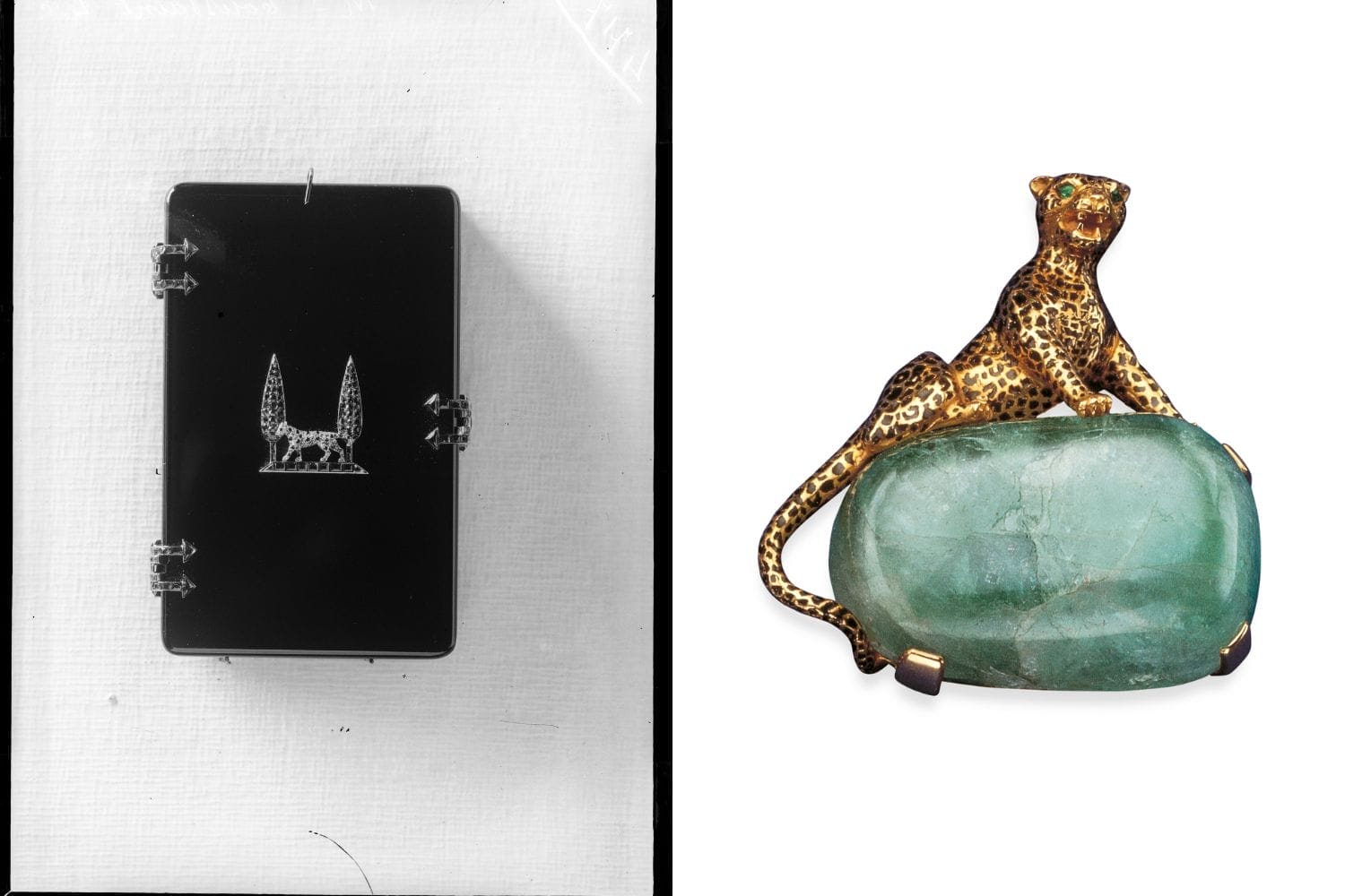 (左起)1917 年,猎豹以完整的侧面形象装饰了一款雪茄盒; 1948 年,猎豹傲然挺立,俯瞰着珍贵的中央宝石。