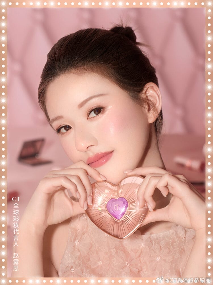 赵露思的腮红和高光选择了限量版 Pillow Talk Beauty Soulmates 爱心腮红盘,盘中涵盖两种色调,扫在苹果肌、下巴和鼻梁处,营造出自然透亮、层次丰富的好气色。柔和的色彩与同系列光感定妆粉搭配使用,不仅提亮肤色、模糊瑕疵,还能增加面部立体感,让妆容看起来清新甜美又充满光泽。限量版设计轻巧便携,非常适合日常或外出活动妆容。