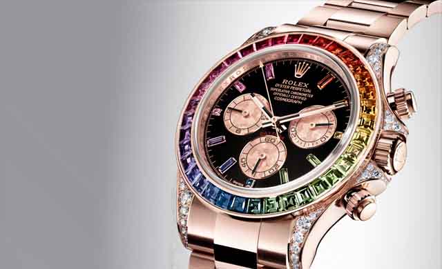 Oyster Perpetual Cosmograph Daytona玫瑰金款可谓是最美Daytona,镶嵌彩虹渐变色蓝宝石及钻石,连刻度都是对应颜色的蓝宝石,令人惊叹品牌的严谨设计与精巧的镶嵌工艺。