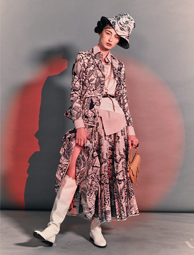 棉帽、棉裙、皮包、皮靴、黄铜戒指/Dior;丝绸衬衫、丝绸上衣/Celine;金属项链/Chanel;玫瑰金色胸针、皮带/Hermès。