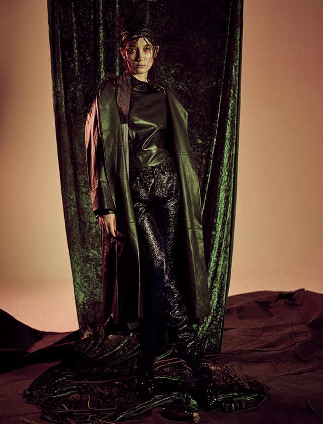 皮大衣和皮上衣/Hermès;漆皮长裤和银色金属项链/Givenchy;水晶缀饰靴/Dolce & Gabbana。
