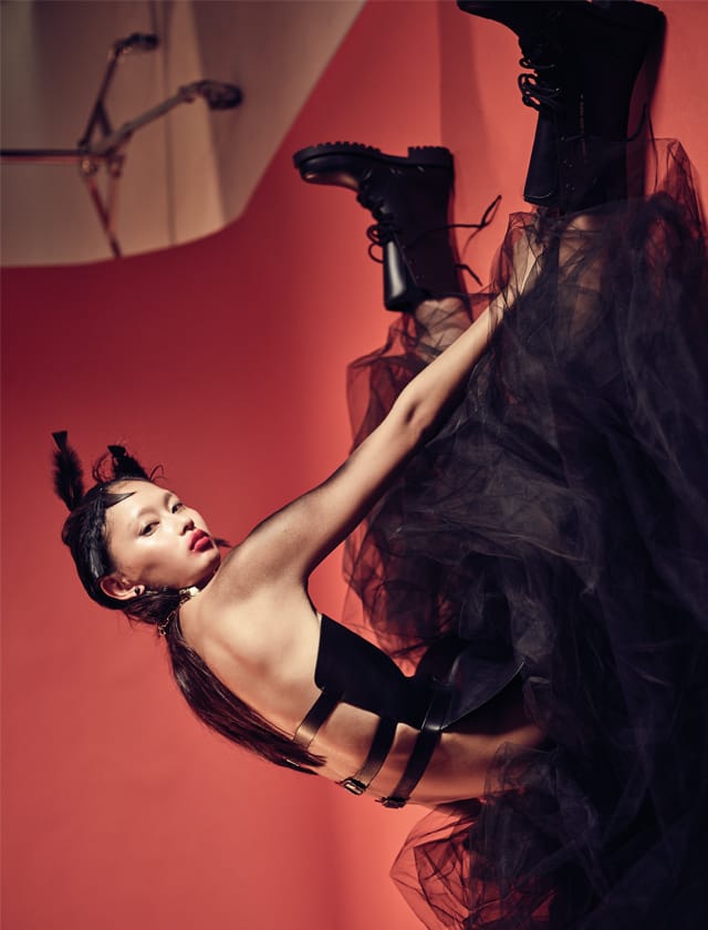 皮革紧身胸衣、皮靴、金色树脂耳环、金色项链/Dior。