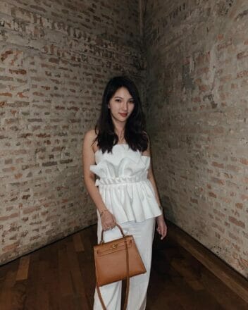 Gigi Leow选择带有褶皱感的上衣搭配白色阔腿裤,为利落的裤装增添层次感,造型舒适又能提升优雅知性美,再搭配爱马仕(Hermes)经典的Kelly手提包,整体造型简约大方,时尚感十足。