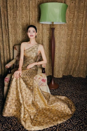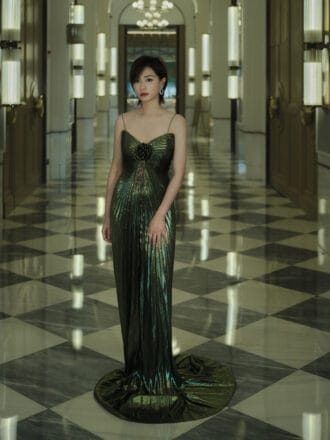 之后,万茜换上的一套古驰(Gucci)褶皱礼裙,绿色的礼裙让她显得温婉动人;她搭配 萧邦(Chopard)珠宝以及罗杰·维维亚(Roger Vivier)高跟鞋,为造型注入奢华气息。