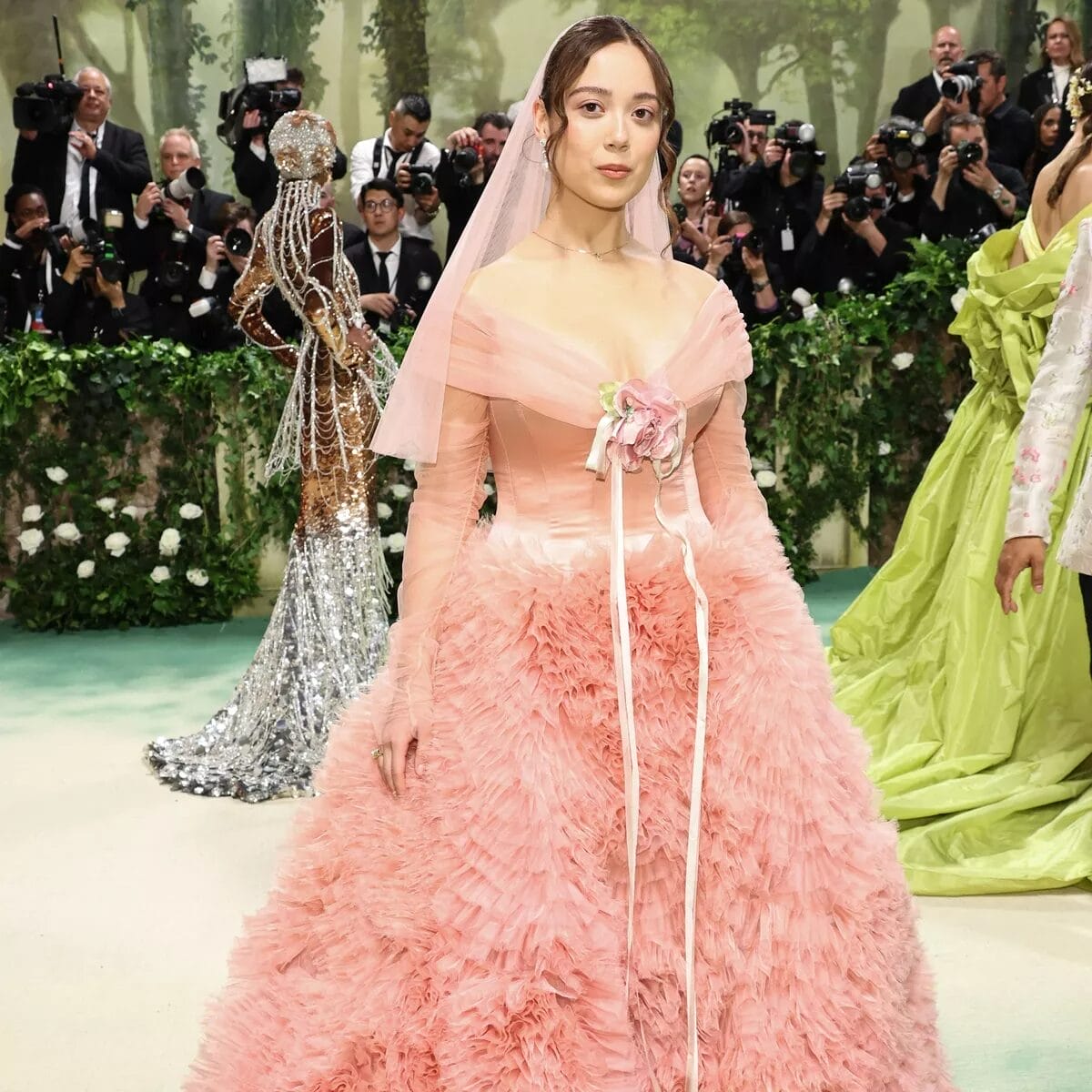 即将来马开唱的冰岛华裔混血爵士女伶 Laufey 林冰也迎来了她在 Met Gala 的首秀。她身穿设计师品牌 Prabal Gurung 的粉色蓬松纱裙,搭配胸前的一枚粉色玫瑰胸花以及头纱,如同化身《Cinderella》童话里的仙女教母,演绎另一种梦幻角色。