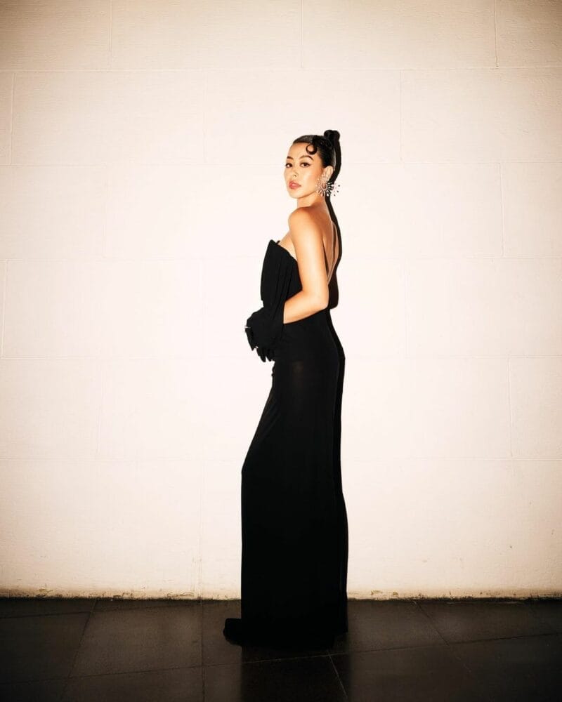 Lulu 的红毯造型以一身鬼马又可爱的夸张蝴蝶结成功出圈,这件可拆卸连身裙出自品牌 BAD BINCH TONGTONG。发迹于纽约的 BAD BINCH TONGTONG 曾赢得众多明星的青睐, 包括 Kanye West、Ariana Grande、Beyonce 以及 Sza。夸张的蝴蝶结下是一件简洁的黑色小洋装,立体的伞状裙摆让这件连身裙在褪去夸张配饰后也依然设计感十足,搭配的丝绒手套让造型多添了几分优雅。Lulu 身上的珠宝来自 Boucheron,露趾高跟鞋则是 Jimmy Choo。