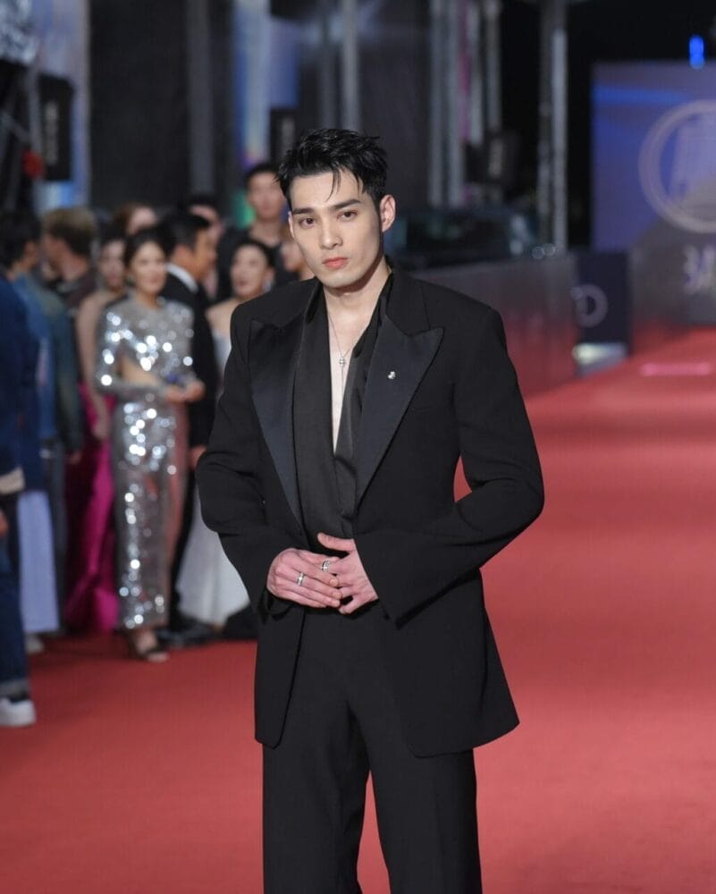 台湾元祖偶像团体 Energy 成员谢坤达以《综艺玩很大》入围《益智及实景节目主持人奖》。颁奖礼当日他身穿 Versace 的条纹西装搭配同款过膝裙,以及 Christian Louboutin 亮面靴子;配饰则有 Boucheron 珠宝以及 Tissot 腕表。他以全黑酷帅登场,为他带来几分神秘的感觉。