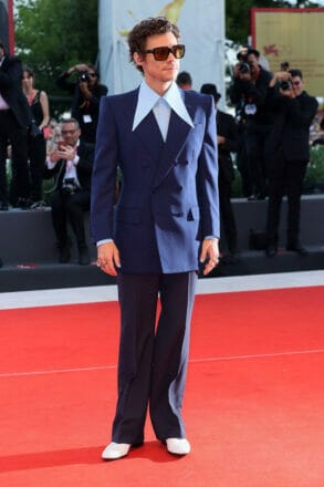 深受古驰(Gucci)喜爱的Harry Styles,这次同样穿上Gucci服装走红毯,这套深蓝色的西装套装,带有浮夸的领口及垫肩设计,打破传统正规的西装,同时更能突显他独有的时尚品味。