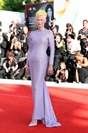 染上新发色的Tilda Swinton以电影作品《The Eternal Daughter》出席威尼斯影展,身穿设计师好友Haider Ackermann设计的饰亮片紫色礼服亮相红毯,简约的礼服加上了垂坠打折曳尾,造型优雅端庄。