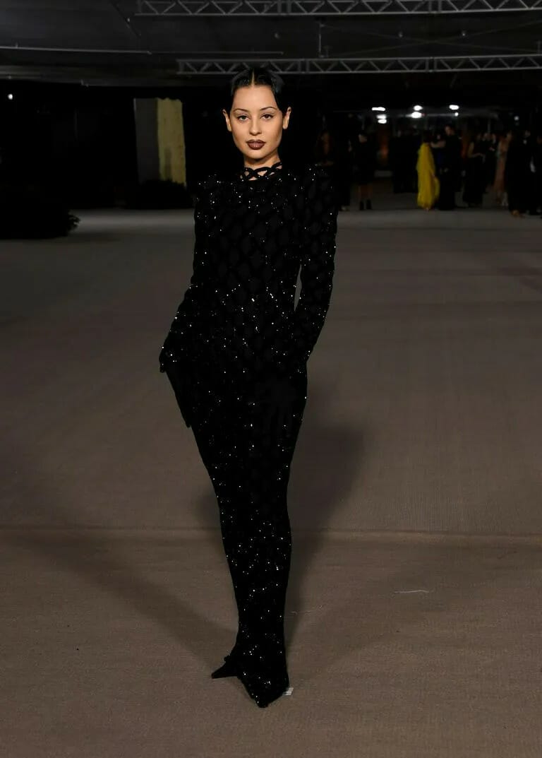 lexa Demie身穿Balenciaga 第51季高级定制时装系列中的黑色水晶刺绣连衣裙,内搭一件手套紧身连衣裤与高跟鞋。