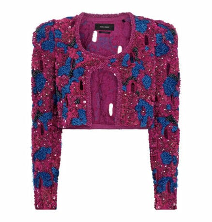 Isabel Marant 2021春夏系列的亮片短外套搭配泰国品牌Pony Stone设计独特的绑带牛仔短裤,桃红色缎面高跟鞋则来自Alessandra Rich。