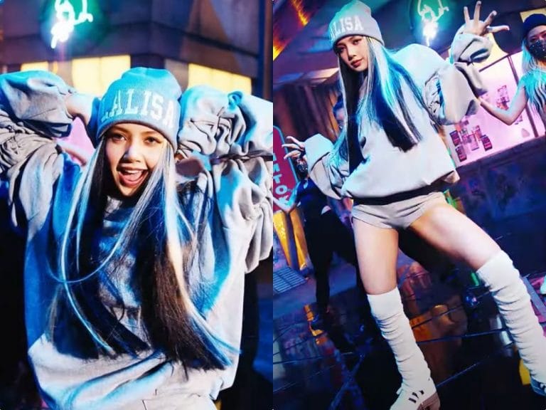 一身休闲穿搭,Lisa头戴绣上自己名字“Lalisa”的beanie帽,穿上灰色宽松卫衣和超短热裤,配搭白色过膝长袜和Adidas波鞋,诠释俏皮的街头时尚感。