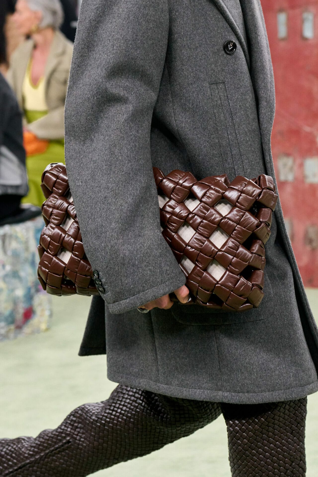 Matthieu Blazy 带领葆蝶家回归纯粹,将品牌标志性的编织元素点缀在简约的服装上,包括将皮革流苏装饰在连身裙与连身裤的肩部上及裙装内衬,同时也将其运用在配饰上——过膝长靴、皮鞋及有如抱枕般柔软轻盈的手袋,反映出意大利的精致技艺。