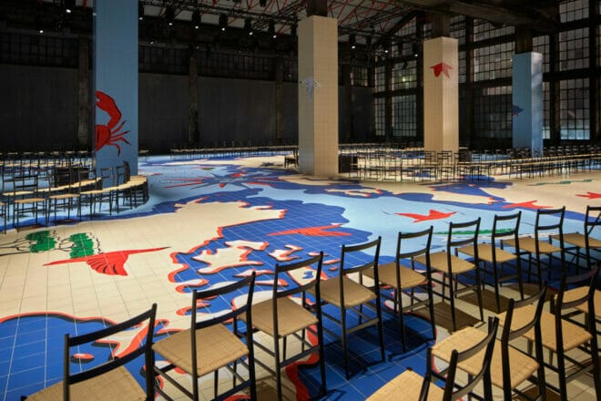 从嘉宾邀请函上可见本季时装秀的主题,以指南针及世界地图寓意一段“自由又充满希望的旅程”。秀场的地板也涂上了抽象版的世界地图,加入了鸟和鱼的图案,模特犹如在秀场上遨游四海。