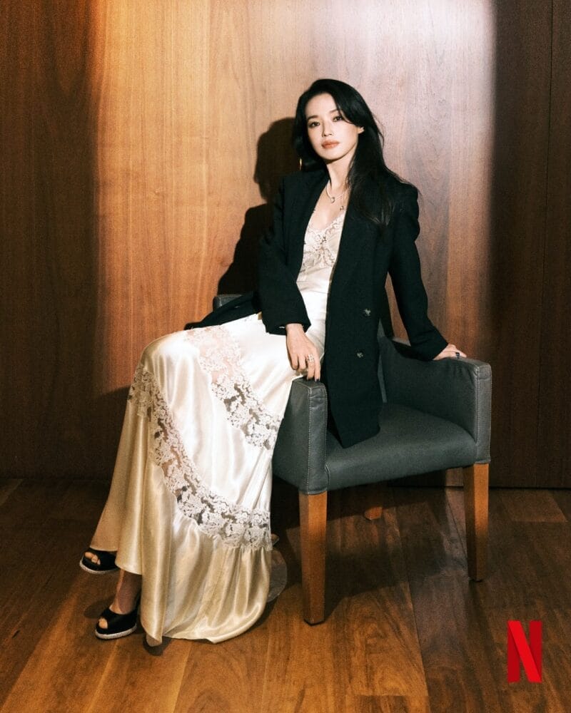 舒淇此次亮相釜山影展,身兼《回魂计》主演与《女孩》导演两重身份。在《回魂计》的映后交流活动中,她以一袭意大利设计师品牌 Alberta Ferretti 26 早春系列的雪纺蕾丝长裙搭配 oversize 黑色西装亮相。柔美浪漫的雪纺长裙在蕾丝处若隐若现,微露肌肤,双排扣西装外套增添正式感,使整体造型呈现刚柔并济的多元魅力。