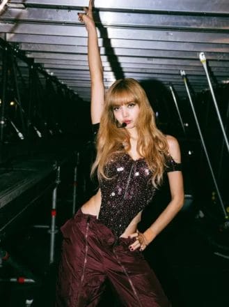Lisa在巴塞罗那举行的“DEADLINE”世界巡回演唱会上,以Fendi定制造型登台。璀璨满饰亮片刺绣的连体衣,搭配酒红色工装裤,尽显自信气场。