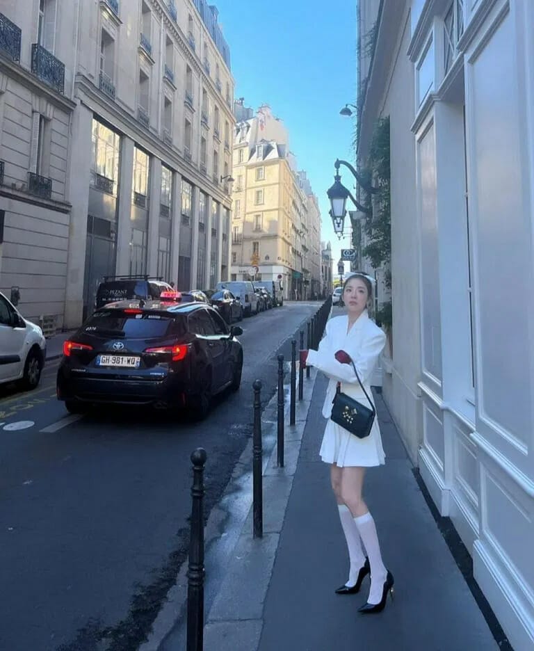 时下流行的小腿袜,主要受欢迎的都是基础色黑白灰,女星也大多采用同色系搭配的穿搭公式,打造和谐感。Fendi 品牌代言人、韩国女星金多美 Kim Da Mi 出席品牌大秀,身穿薄纱包覆的立领西装与迷你裙,也搭配了同色系的小腿袜,优雅又可人。
