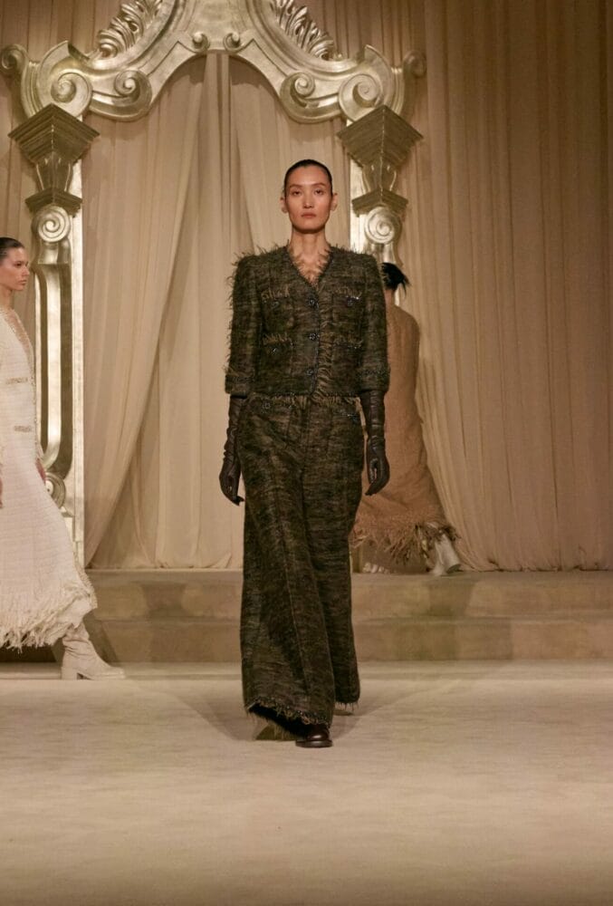 Chanel 创意工作室此次以英伦乡野与苏格兰高地为灵感,回溯冬日经典,推出一系列剪裁利落、色彩沉稳的套装——象牙白、棕色、墨绿与黑色,自然色调贯穿始终。廓形借鉴男装线条,强调自由与舒适,致敬香奈儿女士为女性争取身体解放的先锋精神。