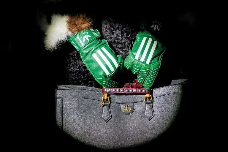 Gucci品牌创意总监Alessandro Michele从两大品牌深厚的设计底蕴出发,将Gucci标志性双G图案、马衔扣及绿红绿织带,与adidas的三叶草标志与三条纹元素巧妙搭配,为造型注入高端品牌与街头潮流风格,模糊了正式与休闲服装的界线。在此之后,adidas乘胜追击与开云集团旗下的另一个奢侈品牌巴黎世家(Balenciaga)开展合作,于2023早春秀场上揭开联名单品。