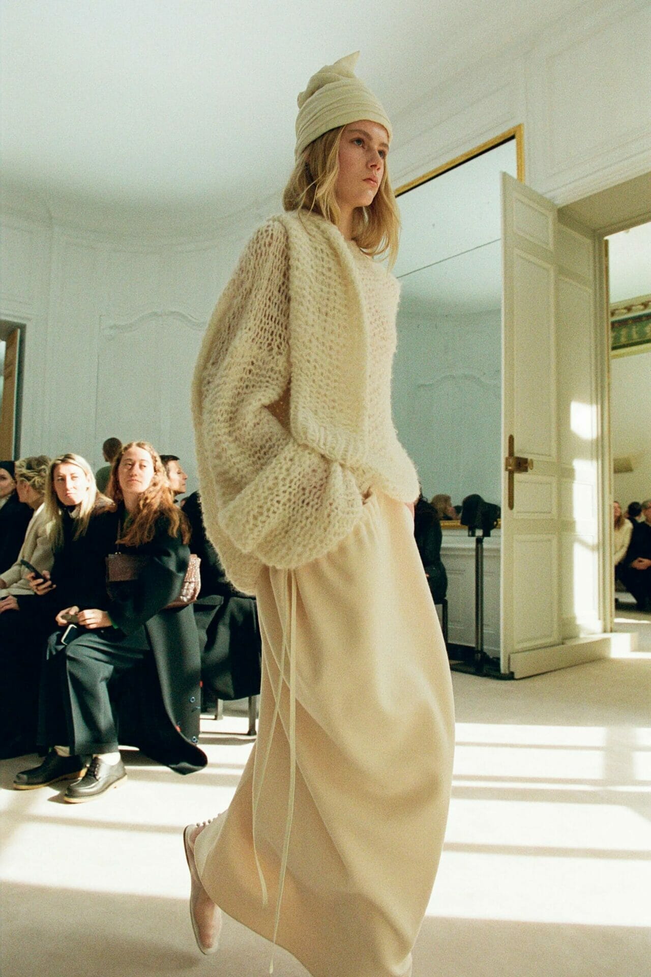 由姐妹花 Ashley Olsen 和 Mary-Kate Olsen 于 2006 年创立的品牌 The Row,向来致力于服装上的结构及剪裁上的创新,追求现代极简风格。品牌本季早春时装秀以欧式门窗作为秀场的背景,模特身穿宽肩双排扣大衣,肩膀一侧披着围巾作装饰,突显造型的廓形,而用色方面则以黑色及大地色为主,当中也穿插亮丽的红色作点缀,整体造型兼具时髦与实穿性。