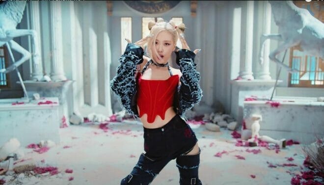 Rosé身穿中国设计师品牌Didu的红色海马毛马甲以及韩国服装品牌Blr Blurer的黑色毛线外套,搭配Skoot的庞克风破损工装裤来与Rick Owens的黑色高筒球鞋,带来精彩动感的舞蹈表演。