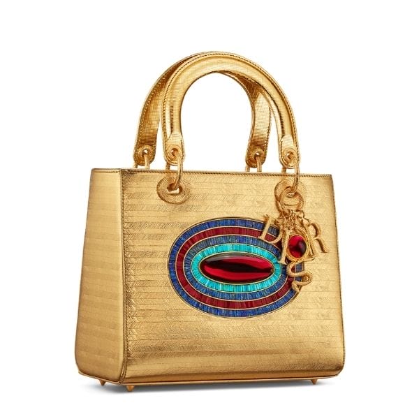 Gisela Colón向埃及文化遗产致敬,以她在埃及吉萨金字塔举办的“Forever is Now”展览为灵感,为Lady Dior手袋变幻出金光闪烁的金色包款。手袋中央镶嵌椭圆形的青金石、红玉髓及绿松石,象征埃及皇后佩戴的珍贵珠宝,再搭配金属Dior字样及蛇形配饰吊坠,尽显华丽高贵。
