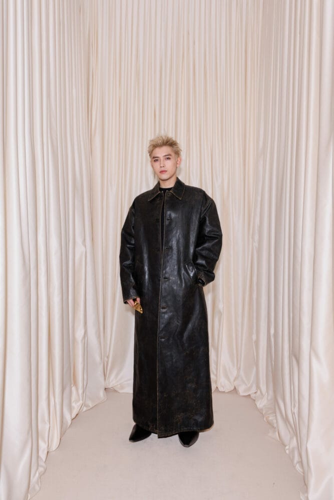 陈飞宇以优越身高完美驾驭皮革长版外套,外套上的做旧处理为整体造型增添一抹个性时尚感。Juyeon 所穿的皮革外套则由腰带拼接而成,不同材质的结合带来丰富的视觉效果,袖子上的皮带也以压痕呈现做旧细节。