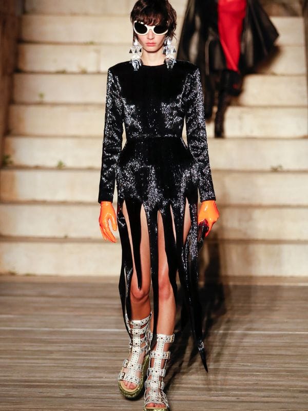 该系列大量运用闪耀的亮片、铆钉、花朵珠子及珍珠等元素点缀在一袭袭华服上,演绎梦幻且浪漫的星空;极具历史风貌的细节如肖像项圈及褶裥围脖等更突显了此次的主题;复古裙装更大胆注入性感元素,直接在腹部呈现挖空设计或在裙摆上加入流苏设计;少不了轻盈飘逸的透视装;予人休闲的牛仔以精致的刺绣点缀,帅气又不失华丽感;绚丽色彩的礼服丰富了人们的视觉张力,还有以条纹呈现的几何裙装,复古又经典。