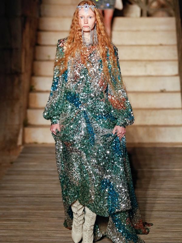 创意总监Alessandro Michele从哲学、历史学家著名的作品中汲取创作灵感,而他也实现了自己说过的一句话,“如果可以的话,我设计的每一件服装都会闪闪发光”,才幻化出有如银河般璀璨的Gucci Cosmogonie系列。
