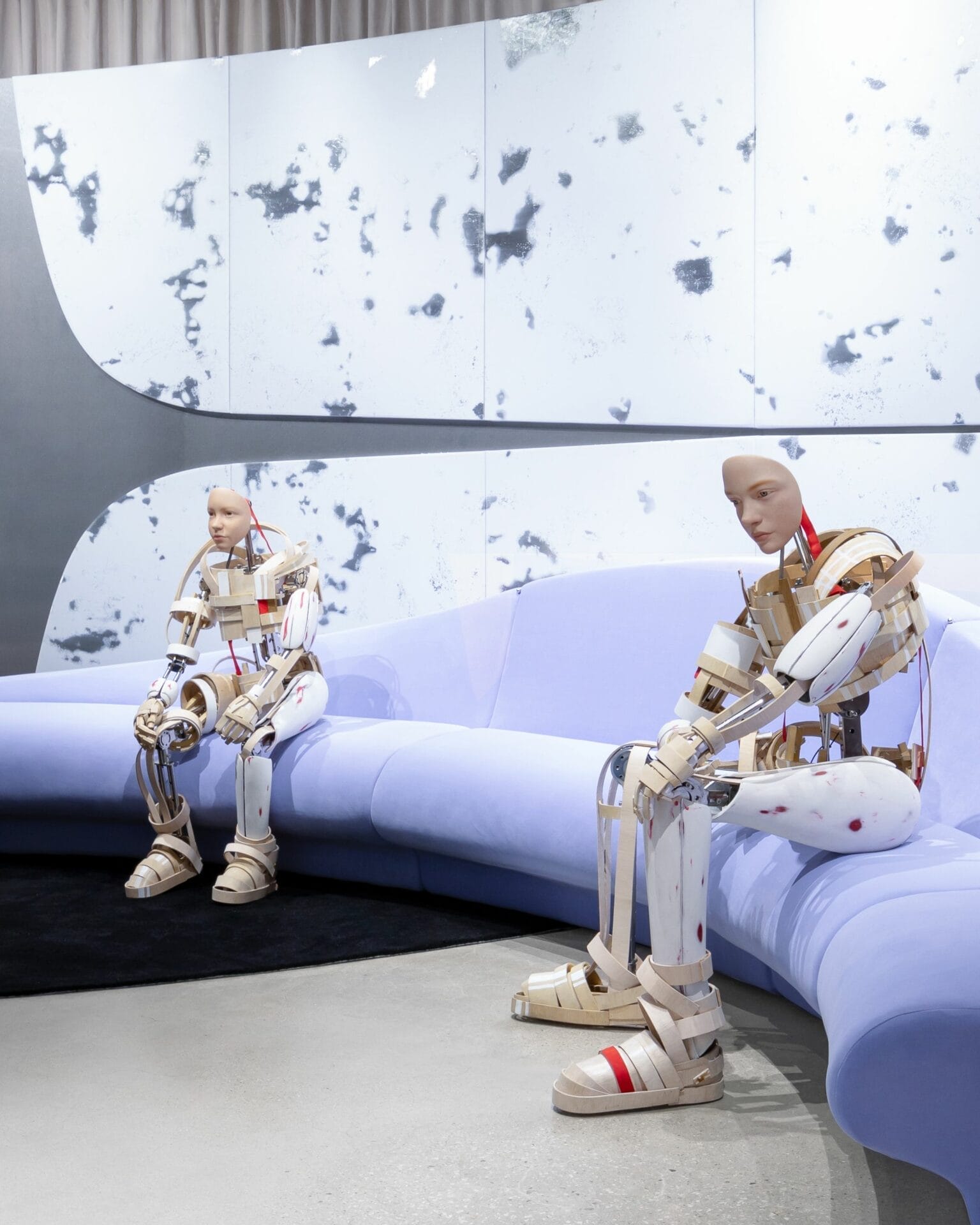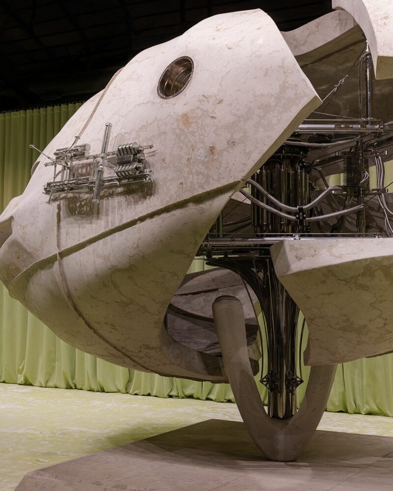 由 Max Siedentopf 与 Haus Nowhere 合作的艺术装置“More Is More”将一个房间变成了一片“会呼吸的风景”。这个装置由一片广阔的黑色塑料袋组成,它们以缓慢而有节奏的波浪起伏,仿佛空间本身有生命。在装置的中心,矗立着一个超大、超写实的年长男子,他的机械眼睛好奇地注视着场景,仿佛在潮汐中寻找隐藏的故事。他手中拿着一个闪闪发光的金色袋子,这个金色成为了好奇心、价值和发现的象征。