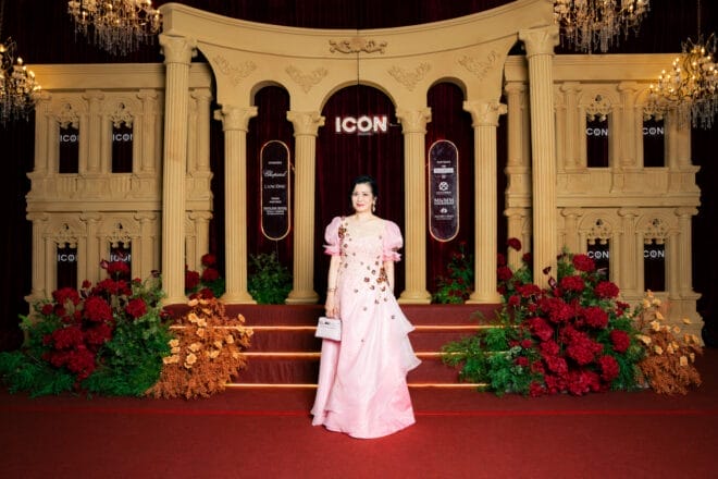 Datin Yokho 身穿的粉红色礼服出自于 Keith Kee Couture 的作品。其蓬袖设计增添宫廷式的浪漫氛围,裙装前方覆上一层白色薄纱,营造出层次丰富的荷叶边造型。为了呼应当晚 “Baroque Opulence” 主题,礼服上点缀多颗金色花朵,为柔美色调注入一抹华丽光芒,展现典雅且高贵的魅力。