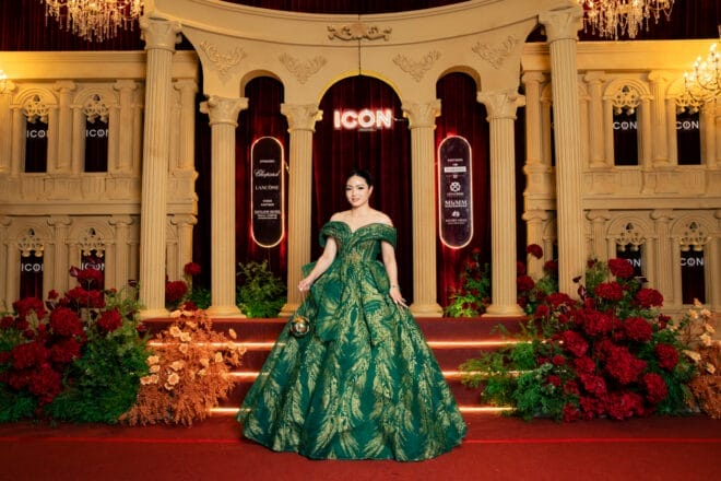 Jas Chin 身穿来自一家独立手工坊品牌 La Belle Fairy 的绿色蓬裙礼服亮相,廓形饱满、气场十足,裙身点缀精致的金色印花细节,在灯光下闪耀出优雅光泽。她搭配一款圆形造型手拿包,为整体造型增添一抹俏皮趣味与时尚感,刚柔并济,风格鲜明。