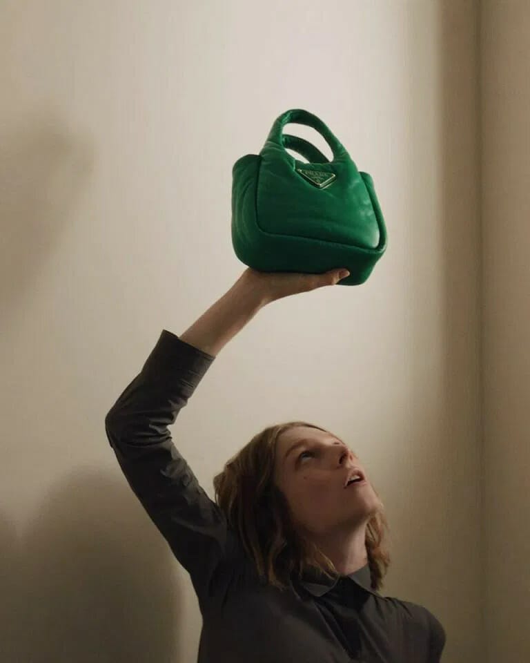 Prada 2023 春夏系列上推出采用带衬垫结构的柔软纳帕皮革制作的手提包,像是枕头般拥有蓬软空气感。手拎包造型小巧简洁,芒果绿色洋溢清新自然气息,三角珐琅徽标成为点睛。