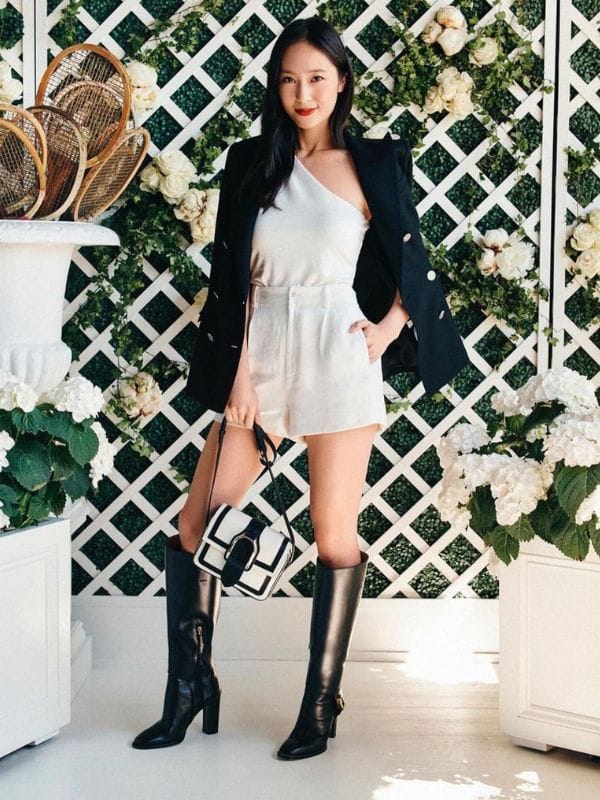 Krystal日前出席温布顿网球赛时,身穿拉夫劳伦(Ralph Lauren)斜肩白色上衣搭配短裤及西装外套。她手上拿的Welington系列单肩包采用小牛皮制成,结合黑白配色的方形包,简约摩登,是各个场合都能派上用场的经典款。