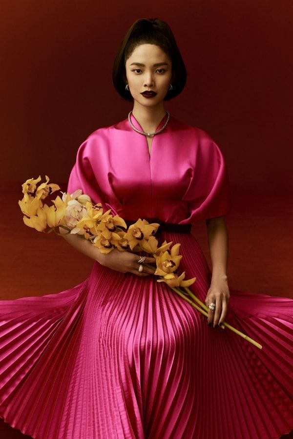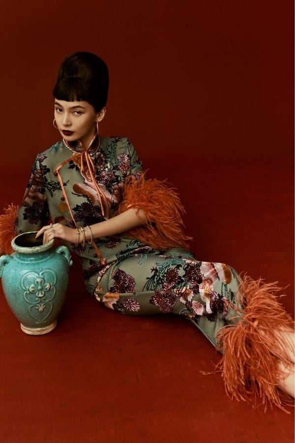 Khoon Hooi今年的农历新年系列带领大家走进李府,一座装饰华丽的庄园,位于吉隆坡最富裕的地区之一,主角李女士接待她的客人在广阔的院子里团聚,而她的新年装扮自然成为亮点,她换上多套服装,当中名为“MeiXing”的黄色旗袍最为亮眼,以带有戏剧性的蓬松袖子呈现,搭配珍珠和莱茵石衬里的纽扣领口;“Liqiu”由天鹅绒及雪纺材质打造的旗袍上衣及裤子,分别缀有灵动的橙色羽毛;还有饰有珍珠的“Bingqing”无袖旗袍等,再配上精致的手袋,整体造型时髦又不失传递美感。