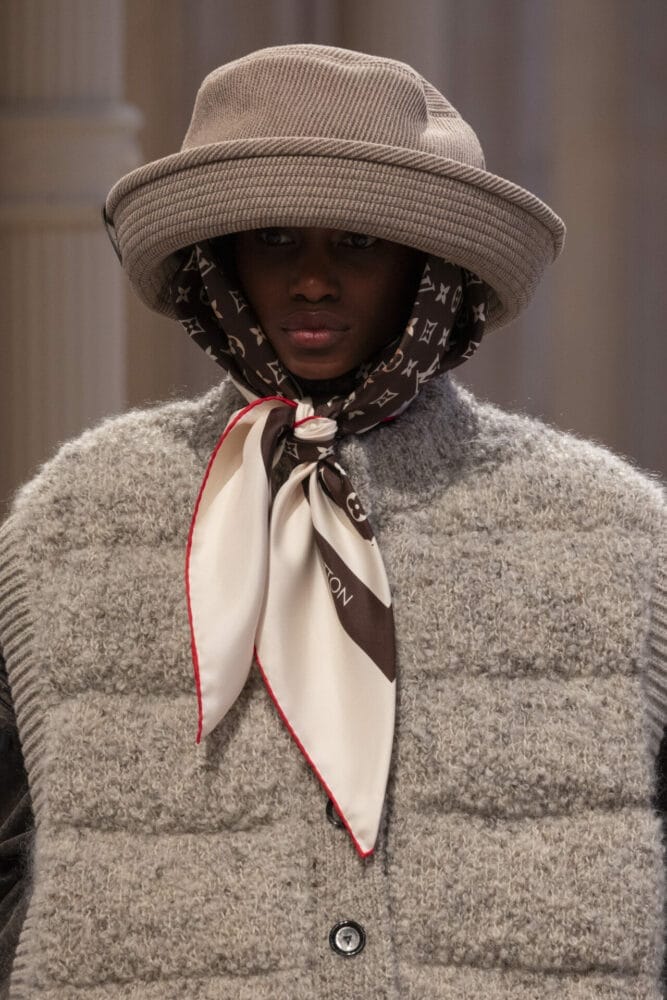 细节设计上,本季强调旅行途中的随性叠搭。模特们手握宽大旅行袋,厚重的围巾随意披在手臂上,仿佛刚刚抵达一个新的目的地。厚底高跟靴为经典造型增添玩味,而点缀水晶装饰的高领连身裙,则在低调中透出一丝精致。帽饰亦成为重要亮点,从夸张廓形的渔夫帽到皮革棒球帽,再到超宽檐礼帽,每一顶帽子都塑造出独特的旅人形象。