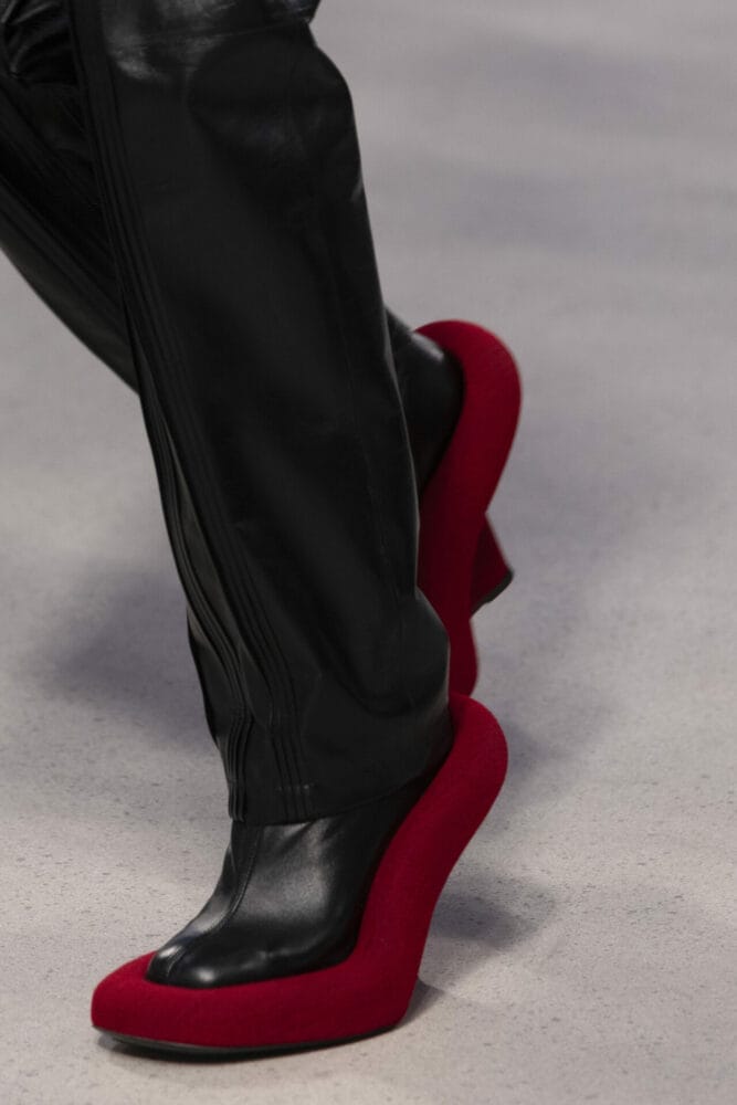 延续了创意总监 Nicolas Ghesquière 标志性的未来主义风格,本季服装融合复古廓形与现代工艺,在结构与层次之间展开对话。复古剪裁与未来感材质的碰撞,营造出丰富的视觉体验。从半透明橡胶风衣、羽毛或流苏外套,到拼接皮革斗篷、层叠褶皱蛋糕裙,每一款造型都强调层次感,巧妙融合 80 年代通勤风格与 19 世纪欧洲贵族元素,打造独特的风格叙事。黑白水牛格纹斗篷与结构感大衣赋予旅人形象新的诠释,流动面料与硬挺廓形相互交错,让步履间展现自由不羁的气息,而超长围巾、宽腰封与多层叠穿的细节,则进一步丰富整体造型的层次感。