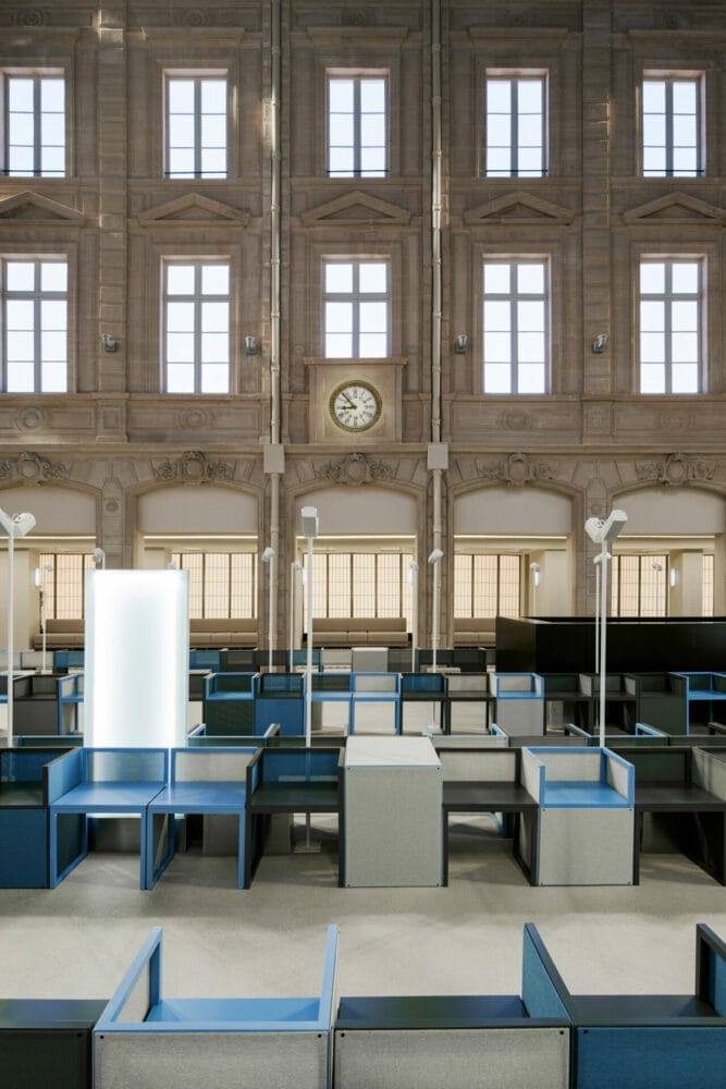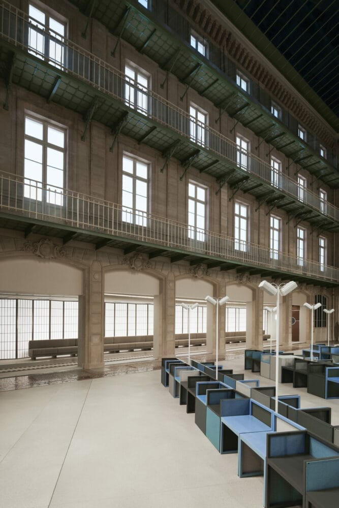 Louis Vuitton 2025 秋冬大秀选址巴黎北站附近一座旧铁路公司大楼,秀场空间被打造为一座复古火车站,充满工业气息的拱形结构、窗格透进的暖色灯光,以及墙上的时钟,共同营造出怀旧与现代交织的氛围。模特们仿佛行色匆匆的旅人,穿梭于月台之间,偶然交会,又匆忙离去,完美诠释旅行的动态感。秀场的三扇门象征着列车的出发、停留和抵达,而地面的灯光变化则仿佛时间的流逝,令整个空间如同一部关于旅行的诗意电影。
