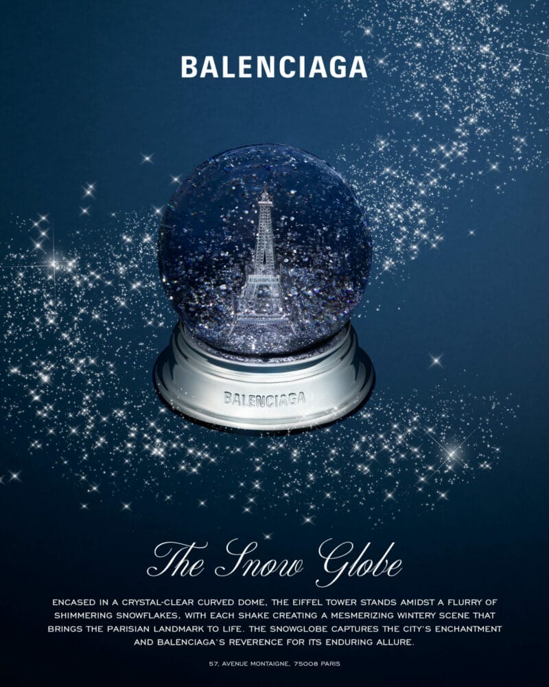 Balenciaga 发布的2024年节日甄选系列,以经典与现代相融合的奢华单品为亮点。此次系列包括标志性的 Le City、Rodeo 和 Hourglass 手袋,以及个性化的 Paloma 钥匙扣,展现出独特的时尚魅力。配饰方面,Bossy 太阳眼镜、Holli 棉绒发夹与与 Jacob & Co 合作的 Diamant Chain 18K 白金镶钻项链增添了奢华感。鞋履如纯白 3XL 运动鞋和黑色漆皮 Avenue 110 毫米高跟鞋则凸显了品牌的先锋精神。艺术家居系列则通过镜面香烛和微缩埃菲尔铁塔雪景水晶球,带来别致的节日氛围。