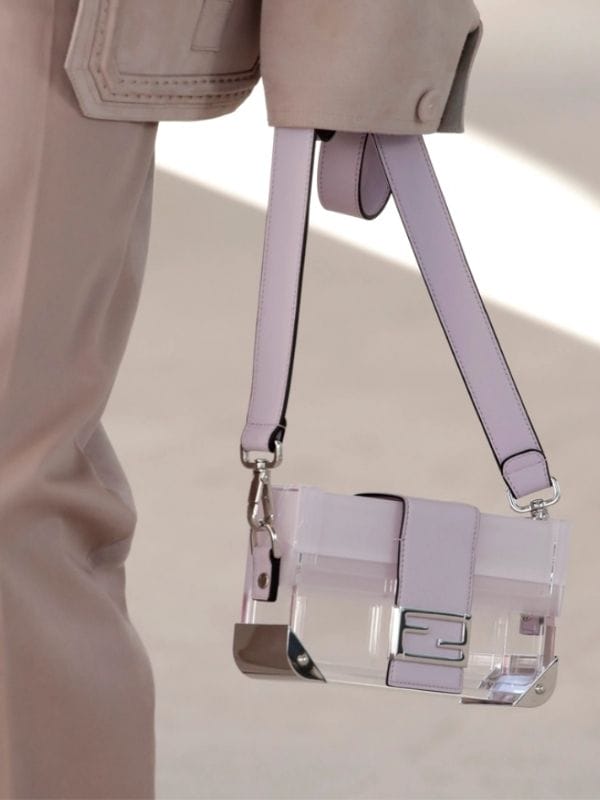 芬迪(Fendi)本季春夏男装的手袋或许身为女性的你也会想要入手,如同这款方形的单肩包将粉色皮革与透明材质结合,配上银色金属边角设计,尽显时尚感。