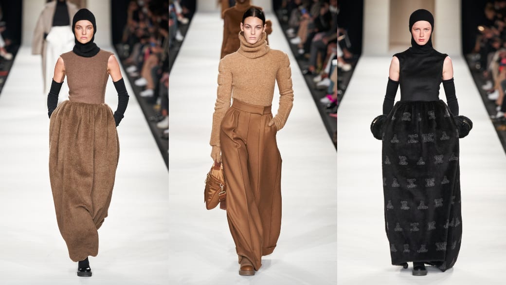精裁夹克、采用双拉链设计的“Cappottino”外套,皆淋漓彰显达达主义风采;而贴合人体的绗缝结构绉胶底针织长靴、拼接衣袖马海毛毛衣,搭配上绗缝尼龙超短裙、高贵优雅钟形长半裙、高领毛衣、巴拉克拉法帽(Balaclava),以及多款厚实针织衫等,都尽显诗意高超的巧思设计。Max Mara本季赋予时装神秘魅力,呈现了微小与宏大、紧身和廓形的富有趣致的对比效果,以鲜明而别致的奇妙设计跃然登场。
