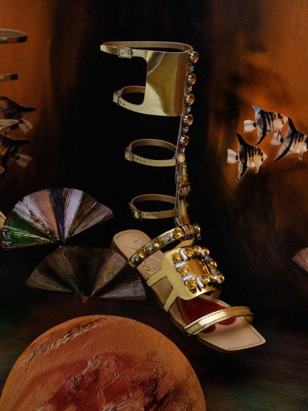 Roger Vivier这双Vivier Gladiator绑带凉鞋设计灵感来自于罗杰·维维亚老先生于1967年设计的Masque系列,品牌将金属材质融入鞋款,而鞋带则缀有水晶饰扣,堪称春夏季最华丽的凉鞋。