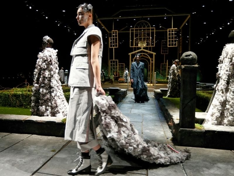 Thom Browne设计的服装一样很有故事性。Thom Browne 在秀前曾透露,此次的设计灵感汲取自大都会博物馆时装学院(The Costume Institute)院長 Andrew Bolton(也是他的伴侣) 所策划的 “In America: A Lexicon of Fashion” 展览主题,聚焦美国服装的过去、现在与未来的面貌,如何随着时间推移变得更实穿。