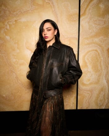 Charli XCX 以复古皮革夹克叠搭纱裙,粗犷与细腻交织出独特张力。夹克的厚重质感映衬纱裙上的牛仔暗纹,在光影下若隐若现,为整体造型增添一抹不羁的摩登气息。