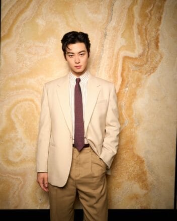 Pansa Vosbein (Milk)以一身宽松剪裁的西装造型诠释率性魅力。双排扣套装搭配学院风条纹领带,硬朗轮廓中融入优雅细节,随性披上的风衣更添一丝洒脱气场,既有复古韵味,又不失现代感。