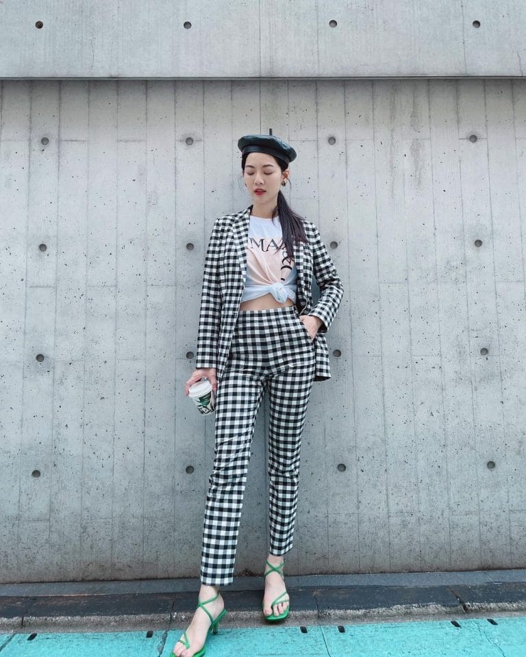 全套的格子西装look是时下最流行的穿搭方式之一,台湾女星曾之乔示范一身极简风的黑白格套装,小露纤腰,搭上文艺感的黑色贝雷帽,打破西装沉稳感,更添活泼趣味的文艺气息。