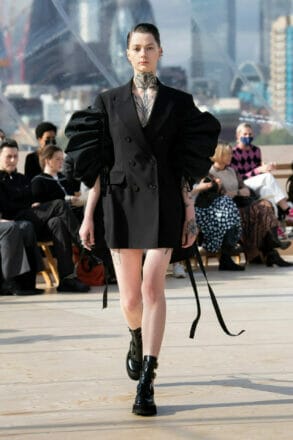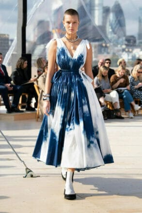 回顾那年的春夏时装周,品牌选择在四大时装周结束后才悠然地出现在大家的视野中。这也是品牌在新冠疫情发生后,时隔两年后再度举办线下大秀。大秀选址伦敦东区沃平巷 Tobacco Docks Yellow Park 楼顶,透明云状装置则由建筑师 Smiljan Radic 构思设计。