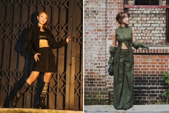 Chloe Ong 身穿的黑色连身裙设计,上半身以轻盈的薄纱长袖为特色,增添了一丝神秘与性感的气质。纱质袖子的半透明效果,为整体造型带来微妙的层次感,同时也展现出些许的性感,整体造型简约而不失时尚摩登感。