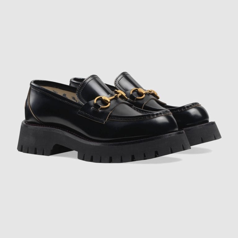 Gucci造型经典的厚底乐福鞋,采用黑色亮面皮革制作,以各种小细节设计添加无限趣味,鞋头处饰有品牌代表性的马衔扣皮, 后侧饰有可爱的金色蜜蜂刺绣图案,鞋子内底则饰有蓝色玫瑰花蕾衬里。整体承袭了传统精髓,同时淋漓尽致地展现了现代时尚魅力。