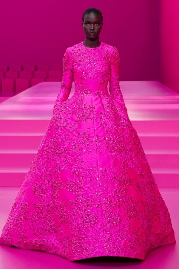 创意总监Pierpaolo Piccioli在华伦天奴2022秋冬时尚系列,与全球色彩权威Pantone合作研发全新的粉红色,并将其单一色调贯穿在整个系列中,重新定义粉红色。